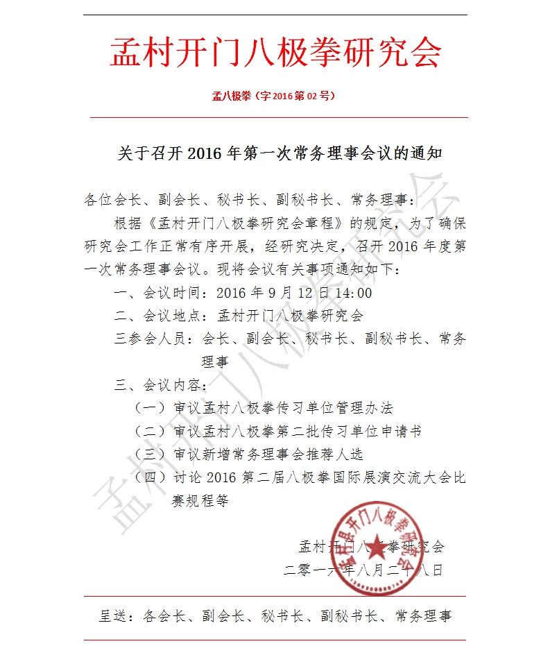 为了增强孟村开门八极拳研究会的活力和凝聚力, 充分发挥研究会在八极拳传承与发展中的重要作用,现就“召开2016年度第一次常务理事会议”有关事项通知如下: