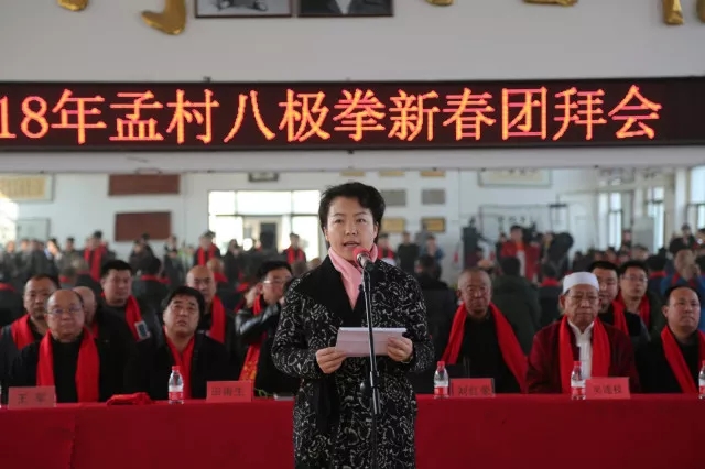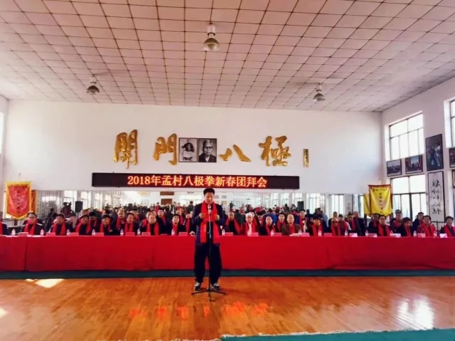 2018年2月22日下午,孟村八极拳国际培训中心演武大厅内,新春团拜会如期进行,孟村回族自治县人民政府刘红荣副县长就孟村开门八极拳研究会对八极拳的保护传承工作表示了肯定。孟村开门八极拳研究会吴大伟会长对来自各地的八极拳门人及爱好者表示了热烈欢迎,并就八极拳在2017年度的成绩以及未来的发展做了详细的总结和新的规划与展望。展演开始后,来自五湖四海的八极拳门人们各个精神抖擞,斗志昂扬。纷纷上场展示自己在上一年苦练的成果,用扎实的功底向大家表达最真挚的新春祝福,共同掀开新一年的又一篇章。