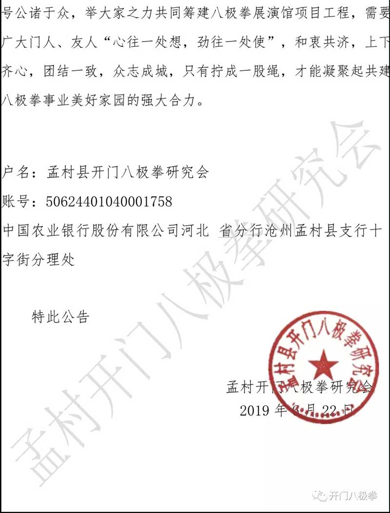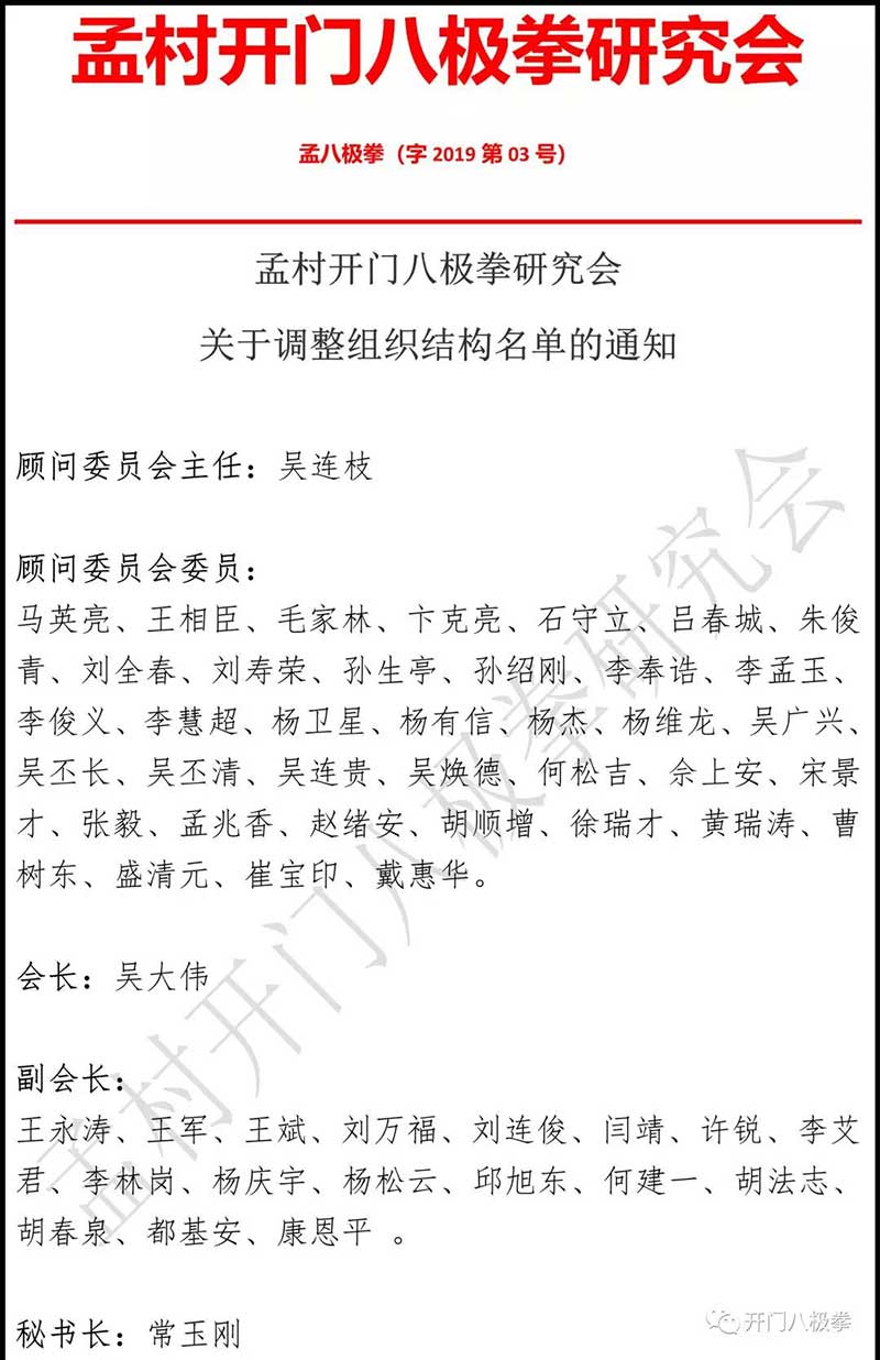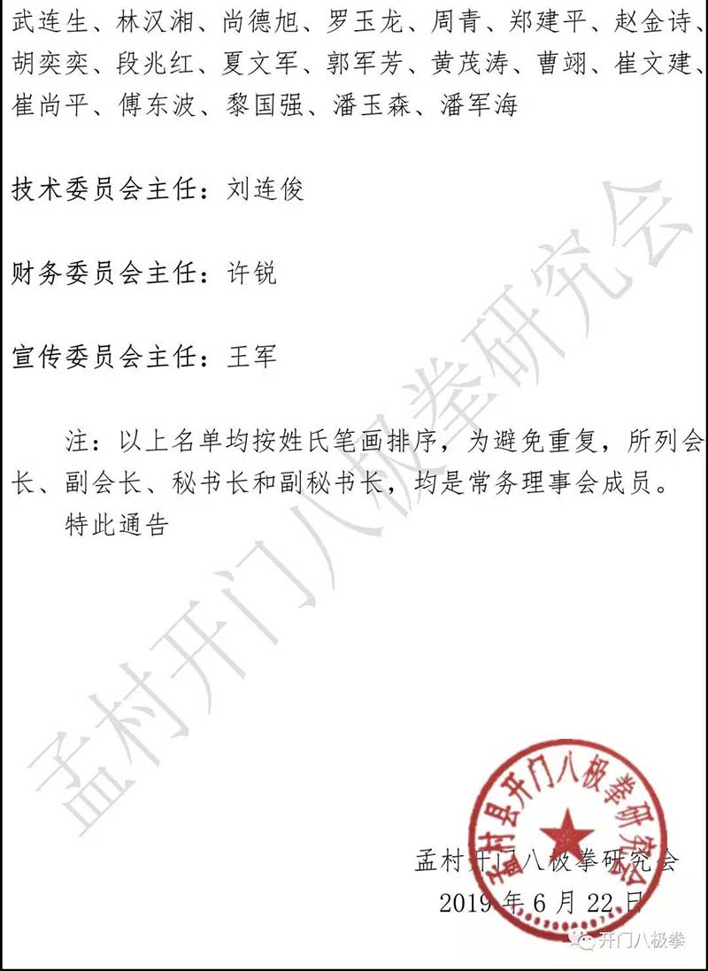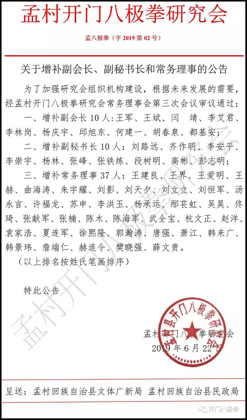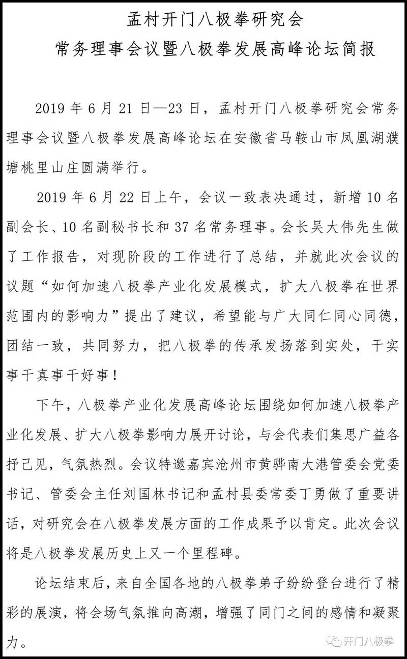 《孟村开门八极拳研究会常务理事会议决议》2019年6月22日!